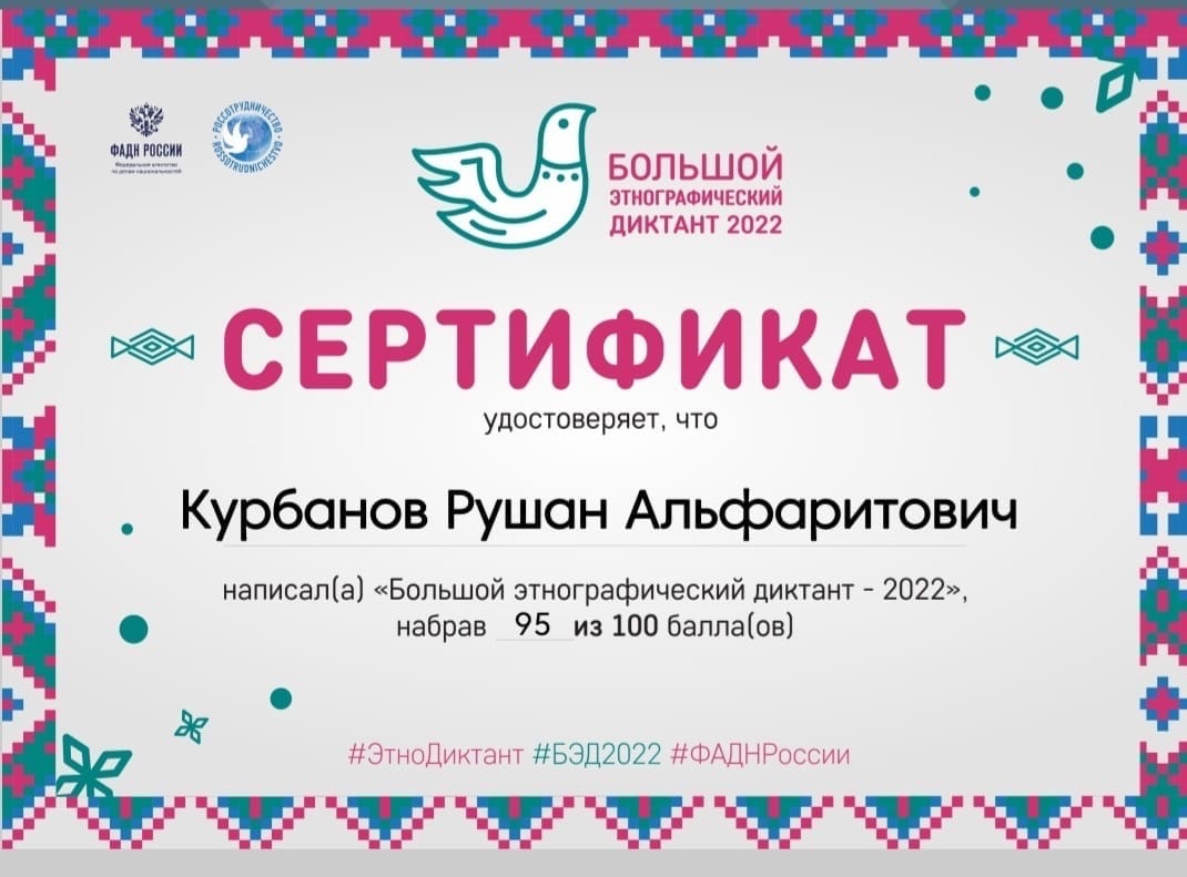 В нашей школе прошёл Большой этнографический диктант 2022! В 2022 учебном году, проведение Диктанта запланировано с 3 по 8 ноября. Диктант проводится с целью оценки уровня этнографической грамотности населения, их знания о народа, проживающих в Российской